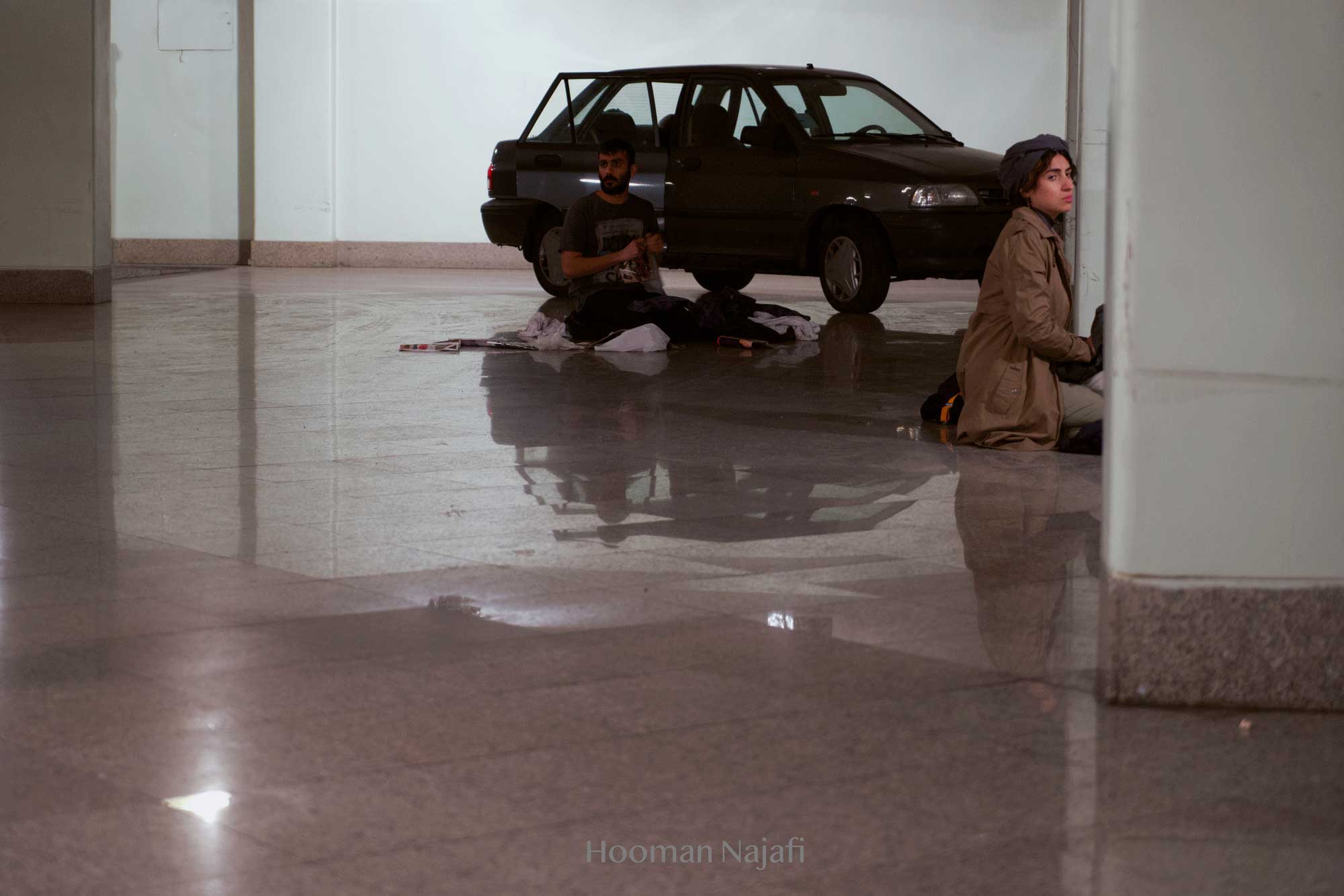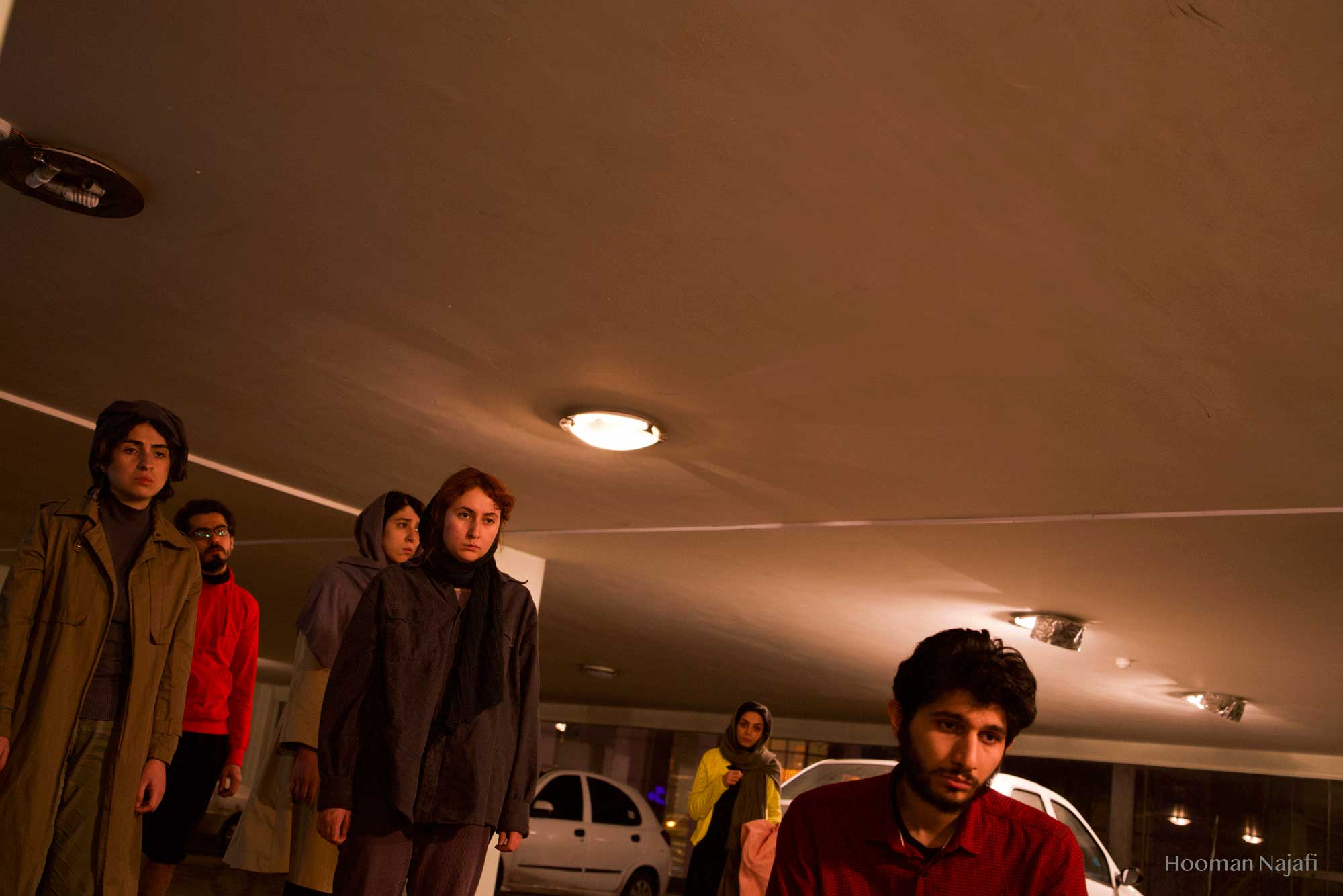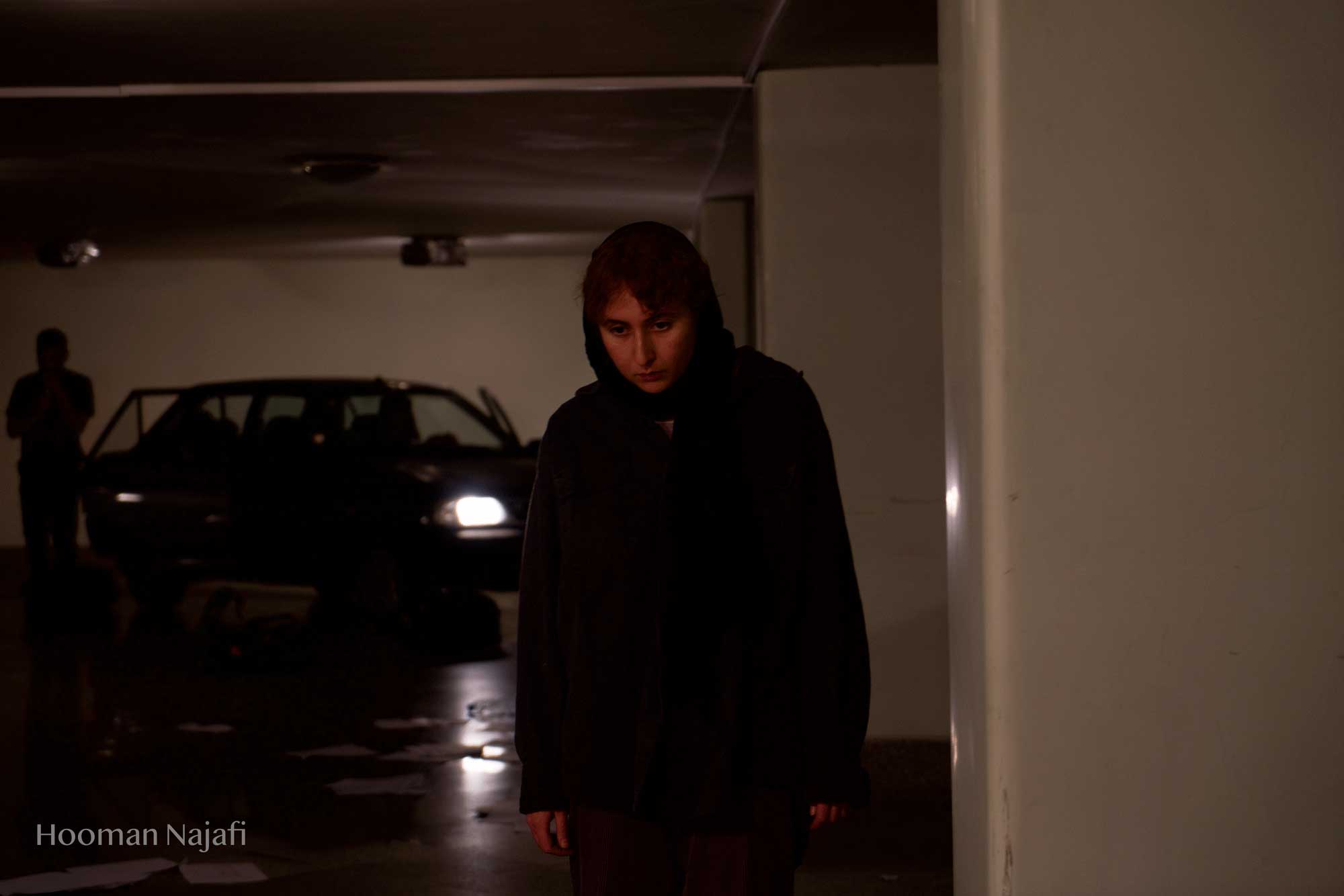 Collapsed performance is non-narrative performance Based on the definition of exhaustion from the perspective of Gilles Deleuze: Not becoming! Deterioration of everything possible! Simply put, nothing happens. Conditions without any progress. So, considering the theory of exhaustion of Gilles Deleuze and study of the works of artists such as Francis Bacon, Samuel Beckett, Franz Kafka and Lucien Freud has greatly influenced the formation of this performance. The performance took place in a public parking in Tehran. A parking with glass walls that allow spectators to see the outside surrounding. This choice was formed with the idea that, the possibility of seeing the world outside the performance, when it occurs to the spectator, the contrast of rhythm and space in the minds and bodies of performers, also the performance space, which is based on the exhaustion and deterioration of everything possible. Makes the body more prominent in relation to the outside surrounding and the normal flow of life.