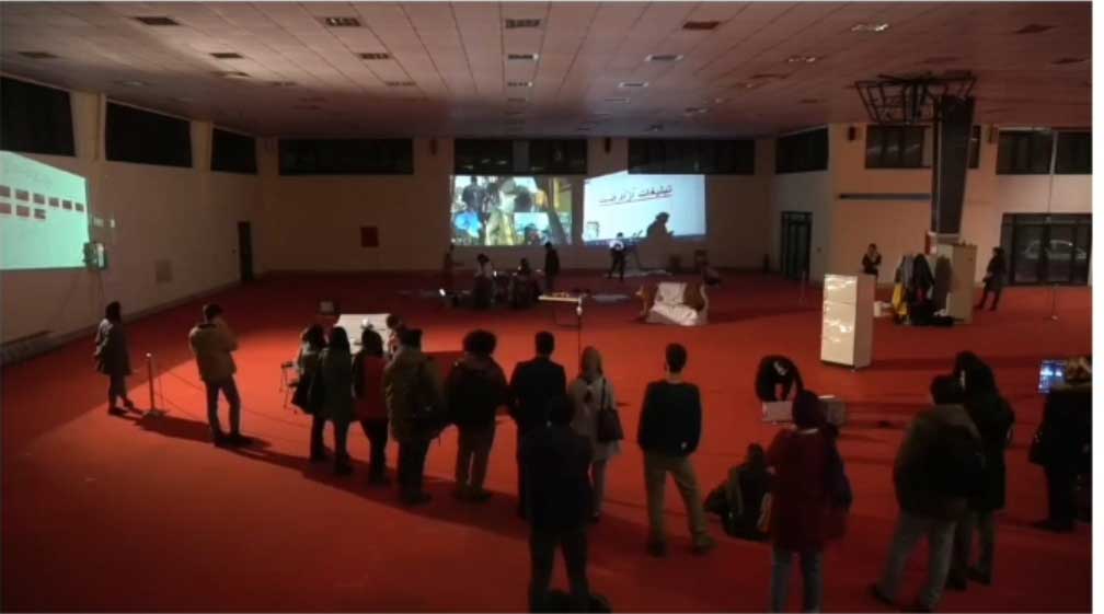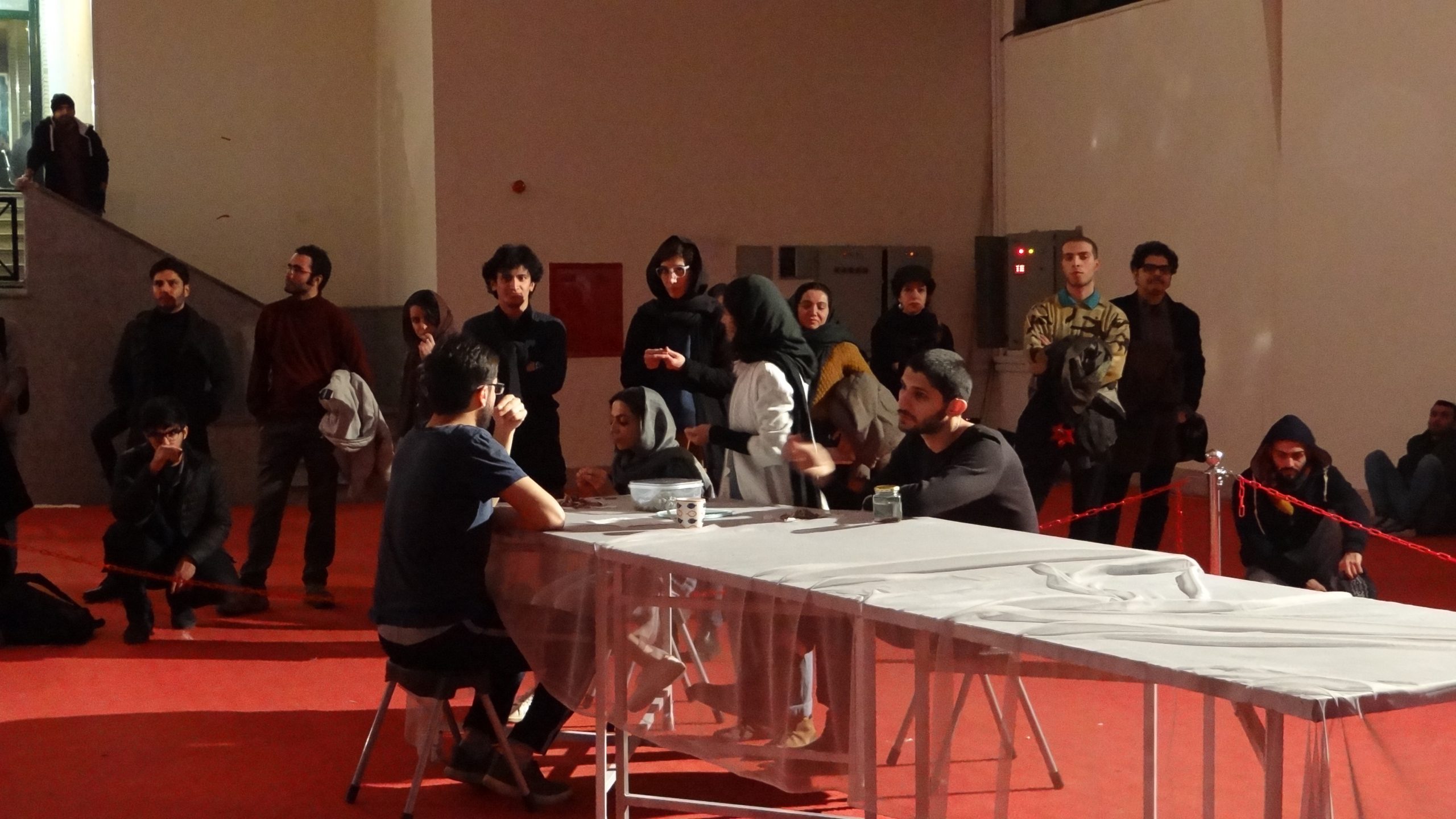 In the performance of "Saeed ..." the most important issue was how human society: how human beings get together and the kind of relationships they create. The collective biology of man constantly leads him to the construction of society, and the construction of this society always leads to the collapse of the collective relationship of man. In fact, human beings are separated by what unites them. As Hannah Arendt mentioned: “What makes mass society so difficult to bear is not the number of people involved, or at least not primarily, but the fact that the world between them has lost its power to gather them together, to relate and to separate them. The weirdness of this situation resembles a spiritualistic séance where a number of people gathered around a table might suddenly, through some magic trick, see the table vanish from their midst, so that two persons sitting opposite each other were no longer separated but also would be entirely unrelated to each other by anything tangible.” The performance took place in a red flat floor of 850 meters. We had 15 performers. and each member had a specific subject and medium for him/herself: video art, video performance, lecture performance, monologue, theater and .... During a process of months, these ideas together produced the output of a unique performance
